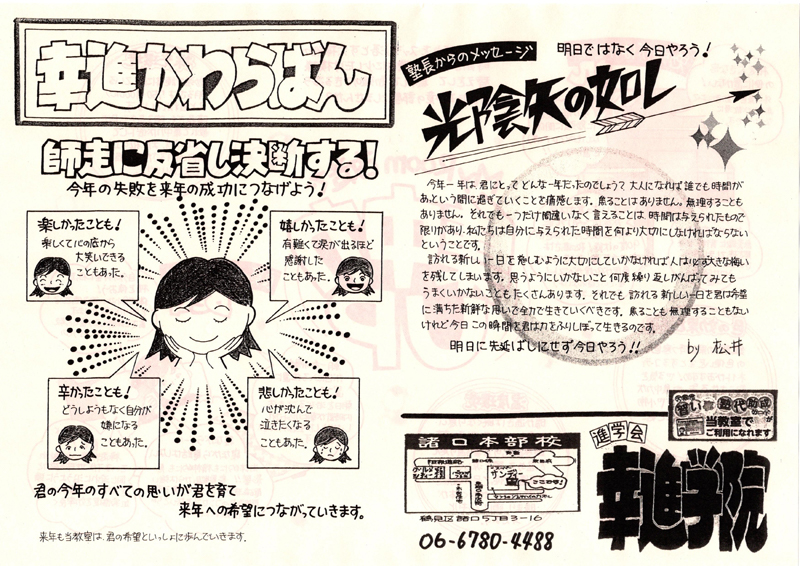幸進学院では他塾のように多人数の詰め込み方式ではなく、生徒一人一人とのコミュニケーションを大切にし、勉強面や生活面などのアドバイスやフォローを責任を持ってさせていただきます。